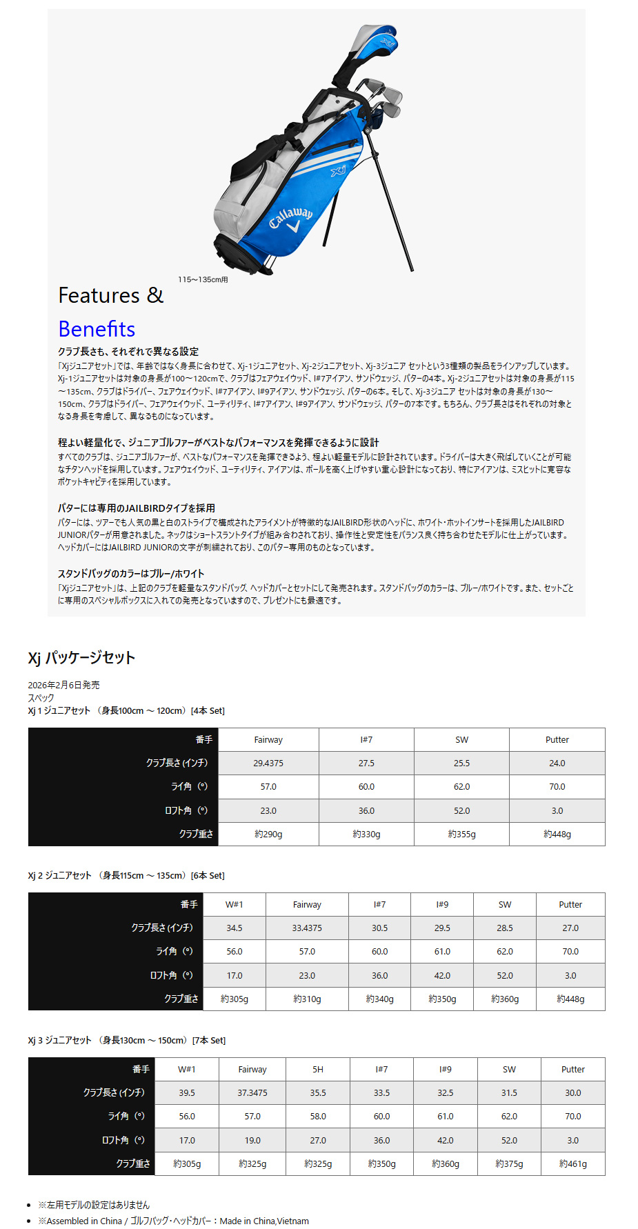 【日本正規品】 キャロウェイ XJ-2 ジュニアセット 2026年モデル 6本セット(W#1、FW、I#7、I#9、SW、PT) 身長115~135cm