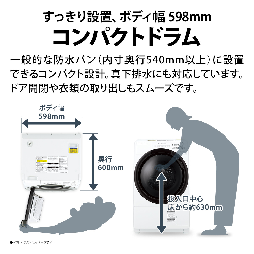 ボディ幅598mmのスリムでコンパクトなデザイン。一般的な防水パン(内寸奥行540mm以上)に設置でき、真下排水にも対応しています。ドア開閉や衣類の取り出しもスムーズに行える、使いやすいサイズ設計です。