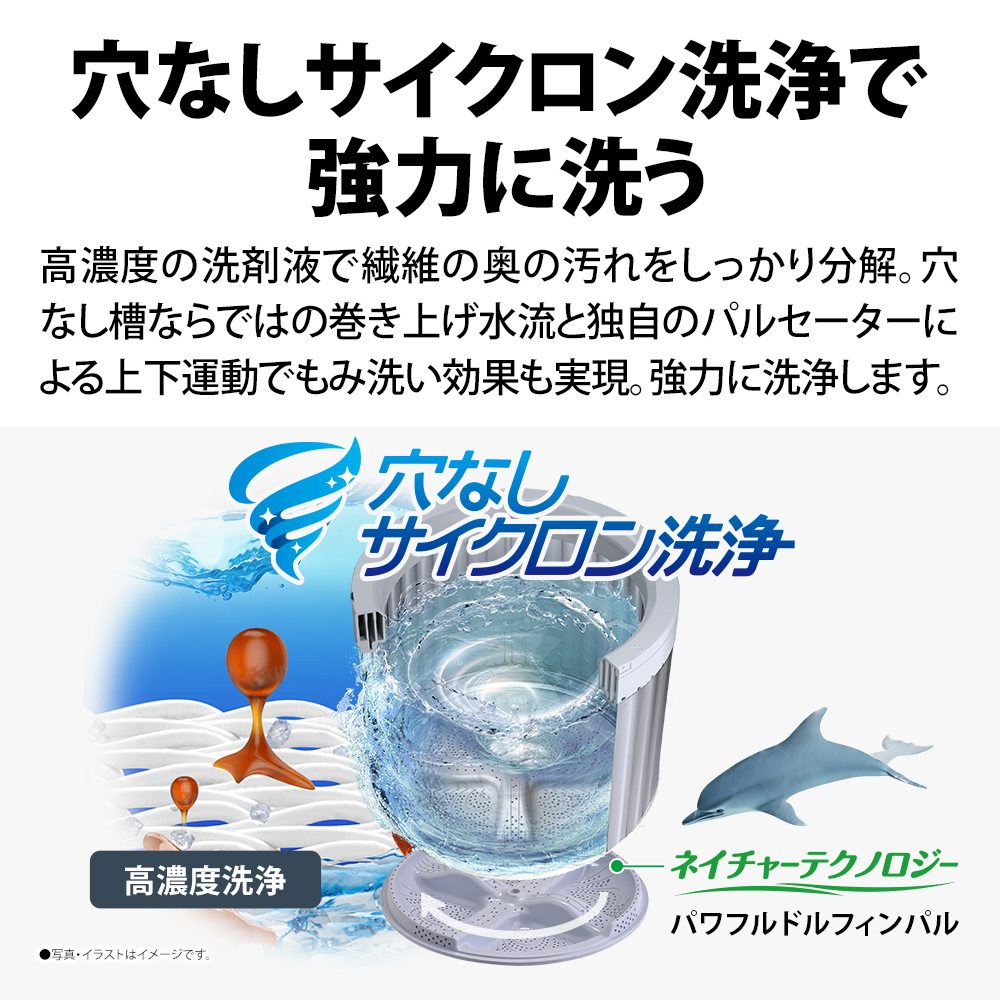 ステンレス穴なし槽なので、洗濯槽の外側や底裏についた黒カビや汚れが槽内へ侵入するのを防ぎ、清潔な水で洗い・すすぎができます。