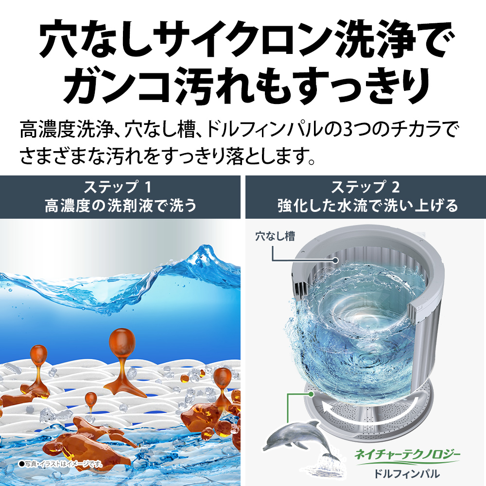 穴なしサイクロン洗浄は、高濃度洗浄、穴なし槽、ドルフィンパルの3つのチカラでさまざまな汚れをすっきり落とします。