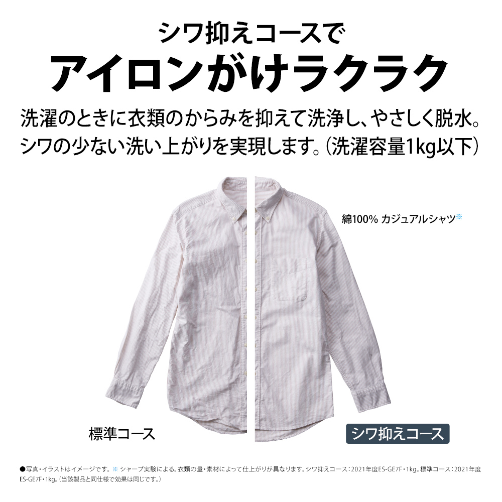 ※ メーカー実験による。衣類の量・素材、汚れや洗剤の種類によって洗浄効果が異なります。ガンコつけおきコース:ES-GE7F・3.5kg。(2021年度、当該製品と同仕様で効果は 同じです。)