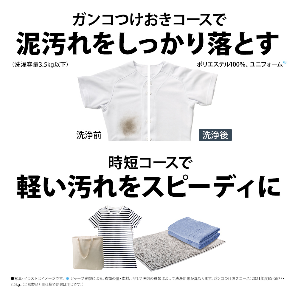 ※メーカー実験による。衣類の量・素材、汚れや洗剤の種類によって洗浄効果が異なります。ガンコつけおきコース:ES-GE7F・3.5kg。(2021年度、当該製品と同仕様で効果は 同じです。)