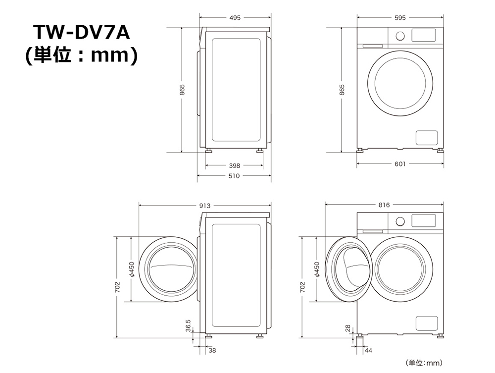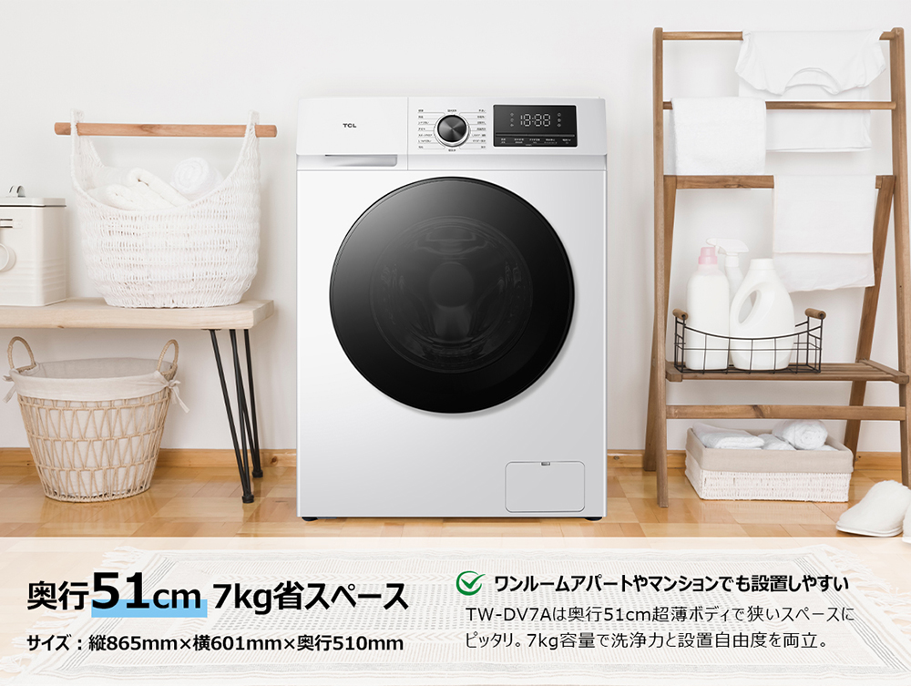 奥行約51cmのスリム設計で、ワンルームアパートやマンションにも設置しやすい。7kg容量で洗浄力と設置自由度を両立。