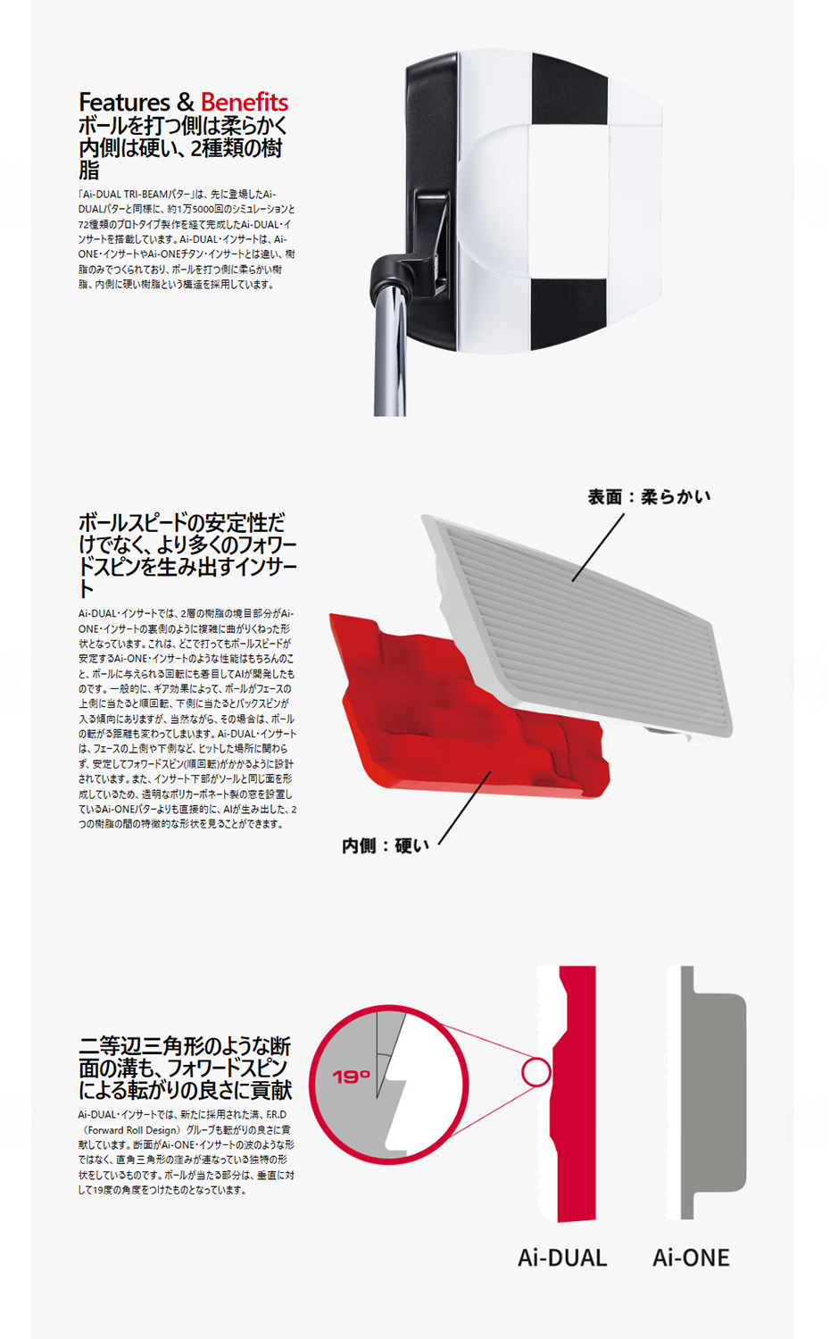 「Ai-DUAL TRI-BEAMパター」は、先に登場したAi-DUALパターと同様に、約1万5000回のシミュレーションと72種類のプロトタイプ製作を経て完成したAi-DUAL・インサートを搭載しています。Ai-DUAL・インサートは、Ai-ONE・インサートやAi-ONEチタン・インサートとは違い、樹脂のみでつくられており、ボールを打つ側に柔らかい樹脂、内側に硬い樹脂という構造を採用しています。