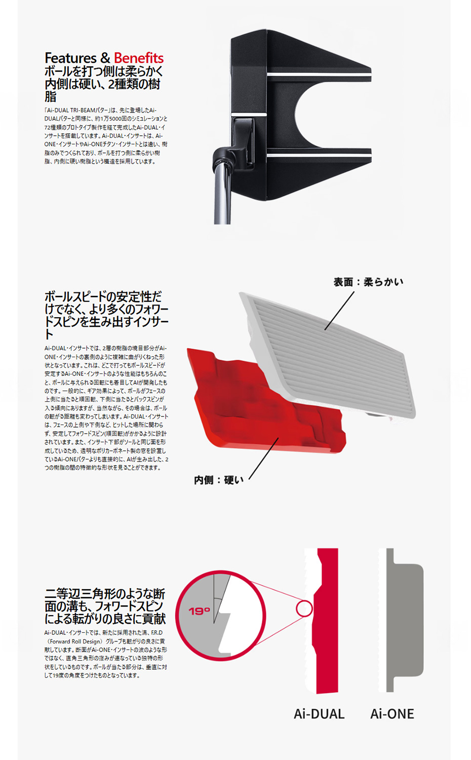 「Ai-DUAL TRI-BEAMパター」は、先に登場したAi-DUALパターと同様に、約1万5000回のシミュレーションと72種類のプロトタイプ製作を経て完成したAi-DUAL・インサートを搭載しています。Ai-DUAL・インサートは、Ai-ONE・インサートやAi-ONEチタン・インサートとは違い、樹脂のみでつくられており、ボールを打つ側に柔らかい樹脂、内側に硬い樹脂という構造を採用しています。