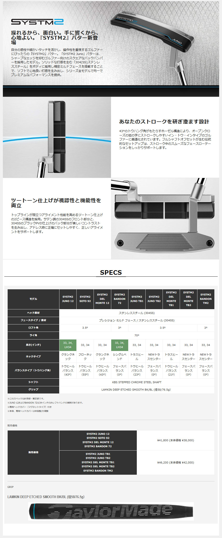 【日本正規品】 テーラーメイド SYSTM2(システム2) パター 2026年モデル ジュノ 12 KBS STEPPED CHROME スチールシャフト 34インチ